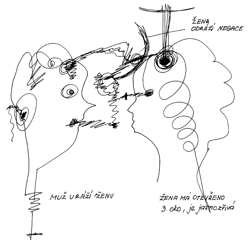 Agresivní a útočný muž vysílá negativní myšlenky a slovně hrubě uráží partnerku. Nechce zároveň slyšet, co mu partnerka sděluje. Tato odráží veškeré jeho negativní útoky, které se agresorovi vracejí zpět. Žena je velmi pozitivní a má otevřené mimosmyslové vnímání. Jeho přístup se jí nedotýká.
