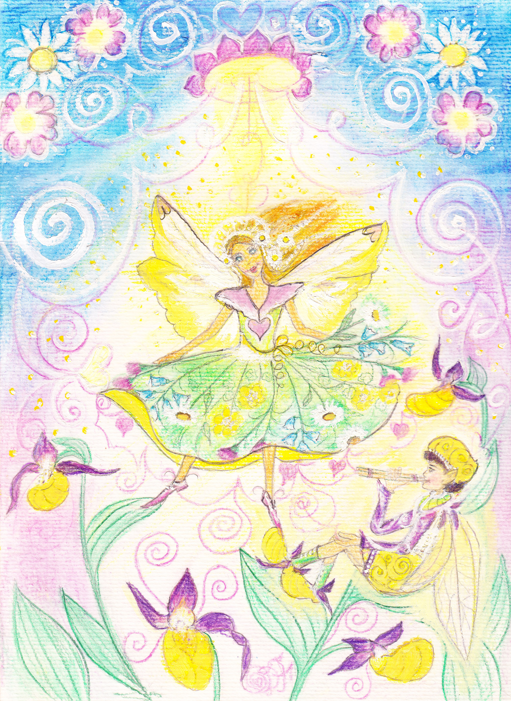 2. Luční víla tančí svému milému příteli Pantoflíčkovi. (Pantoflíček = Střevičník - vzácná česká orchidej, která roste u nás ve Středohoří a Polabí)