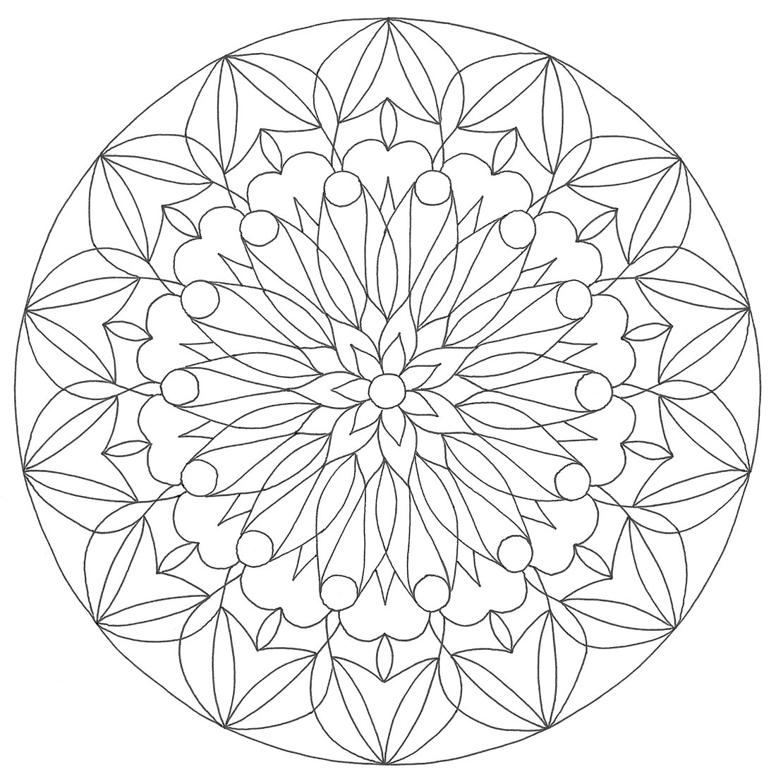 A potom? Nalaďte se na své nitro, na lásku a harmonii v sobě, na víru a světlo v sobě a na to, co chcete mandalou zviditelnit, a jednoduše malujte. Symboliku barev pro tuhle práci nepotřebujete. Každá barva nebo její odstín v sobě zahrnuje pozitivní i negativní aspekt a rozumové rozhodování, zda použít tu či onu pastelku, práci narušuje. Zeptejte se svého citu, a on Vám tu správnou barvu pomůže vybrat. Můžete jednotlivé plošky prostě vymalovávat, můžete stínovat, ty které chcete nechat bílé jednoduše nevybarvíte. Máte-li k dispozici například 3 odstíny od jedné barvy, můžete plošku při vybarvování stínovat od nejtmavší až k nejsvětlejší. Jednotlivé linie je možné barevně zvýraznit a kdyby se vám některá mandala zdála příliš hustá a nepřehledná, jednoduše některé linie pastelkami zamalujte v rámci většího motivu. A nebo můžete i něco dokreslit. Zkrátka při tomto způsobu tvoření je dovoleno cokoli. Důležitý je zde jen a jen váš cit a naladění.