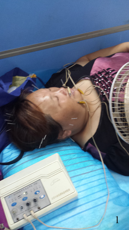 Nejvíce pacientů bylo s obrnou lícního nervu, možná i proto, že je na tento problém profesor vyhlášený (obr. 1). Všemi jehly otáčí a manipuluje s nimi už při napichování, ke spoustě jehel se pak přikládají elektrody, nebo na ně napichují a zapalují kostičky moxy, či přes ně přicucnou baňky. Ale toto dělají na jeho pokyn místní „poskoci“, resp. ostatní doktoři. V ordinaci je tak z čadící moxy nakouřeno (pro někoho nasmraděno) více než dost. Ve škole mě učili, že dobrý akupunkturista se pozná podle toho, že napichuje málo jehel, prof. Wang však jehlami nijak nešetří. Naopak, lidé vypadali občas jako jehelníčky. Vyšetření mu trvá max. dvě minuty, určitě ne každému změří puls nebo koukne na jazyk, aby se někoho na něco dopodrobna vyptával, to rozhodně nehrozí. Bylinné recepty píše z hlavy a i toto mu trvá řádově minuty. Na to, abych zjišťoval, z čeho se recept skládá, zatím nebylo ani pomyšlení. Občas řekl název vzorové směsi, ale tuto vždy modifikoval ať už přidáním jednotlivých bylin nebo změnou gramáže. Při jeho rychlosti nebylo vůbec myslitelné, že bych k tomu něco více zjišťoval. Byliny píše výhradně na týden a pak buď recepturu více či méně změní, popřípadě ji nechá stejnou. Akupunkturu aplikuje zásadně 3x týdně, a to i po dobu několika týdnů. Jedno ležení trvá 30 minut a nikdy člověka nenapichuje oboustranně, tj. napřed zezadu a poté zepředu, ale vždy jen z jedné strany, popř. zboku. Některé lidi léčí jen jehlami, jiné bylinami a další obojí metodou současně. I takový profesor má své oblíbené body – jak jsem viděl, téměř každému píchal (mimo jiné) kombinaci tří bodů na nohou (ST 36, GB 34 a SP 6) a k tomu TE 5 na rukách. Občas píchá po akupunktuře do bolestivých míst (např. na „zmrzlé rameno“) injekci, ve které jsou prý obsaženy jak byliny, tak chemie.