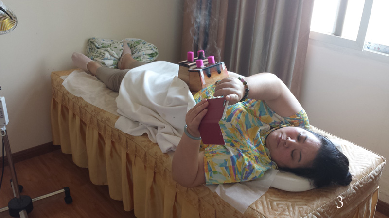 Nemocnice byla oproti včerejší klinice celkem luxusní, ale i tady už čekala spousty lidí s pořadovými lístky v ruce. Ordinací zde bylo ještě více než včera, léčba však probíhala úplně stejně jak už jsem zažil – všechny lidi vyšetřoval, navrhoval léčbu, psal recepty a napichoval jehly pouze sám profesor, ostatní doktoři mu byli jen k ruce. Tj. přikládali na určená místa baňky (obr. 2), zapalovali moxu (obr. 3) nebo přikládali na jehly elektrostimulaci (obr. 4).