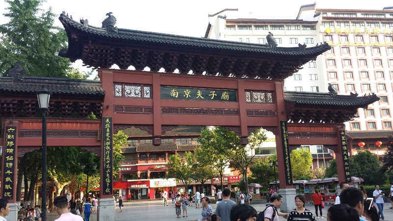 V pět hodin odpoledne jsem konečně vylezl ven a vyjel na prohlídku Konfuciova chrámu, který je od hotelu jen pár zastávek metrem a který jsem měl doporučený z několika stran. Lístek, resp. modrý žeton jsem si už zvládl koupit sám (2 yuan) a i s přestupem jsem byl na místě asi za 20 minut. Komplex Konfuciova chrámu je obrovský, kromě dvou opravdových chrámů (kde se platí vstup 25 yuan) to jsou jen uličky mezi starobylými domy a dvěmi říčkami, ve kterých jsou natěsnány vedle sebe restaurace a obchody. Nebudu přehánět, když napíši, že zde byly stovky větších či menších restaurací, o něco málo méně obchodů s předraženými tretkami a suvenýry a také značkových obchodů s ještě více předraženými hadrami a botami. Všude kolem chodilo tisíce čínských turistů, kteří jedli, pili, nakupovali a byli docela hluční, bělocha jsem nepotkal ani jednoho. (Obr. 7 – 10)