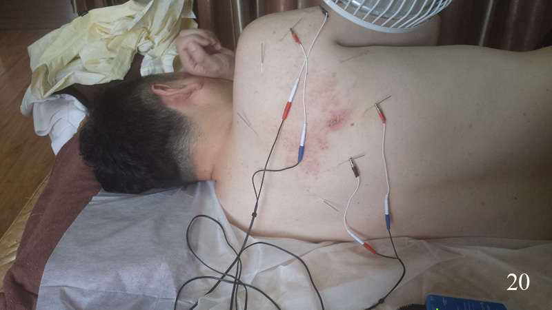 3. Doktor jakž takž dodržuje desinfekci bodů před napíchnutím, ale klidně holou rukou osahává chlapíka s pásovým oparem přímo na místech vřídků a pak, bez umytí rukou, jde hned k dalšímu pacientovi. Mimochodem tvrdil, že u tohoto onemocnění je úspěšnost akupunktury naprosto stoprocentní a že pásový opar lze tak vyléčit za kratší dobu a bez následných postherpetických bolestí oproti klasické léčbě. Tzn. že při akupunktuře se nemusí podávat antivirotika! (Obr. 18 – 20, foceno v průběhu jednoho týdne.)
