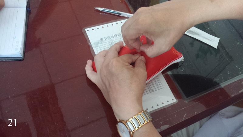 Úplně na konci nás profesor všechny učil, jak bezbolestně píchat jehly. Kromě správného držení jehly (oběma rukama – jednou rukou za dřík a druhou těsně u kůže, resp. u bodu) tkví tato metoda v roztočení jehly a rychlém průniku jehly kůží (obr. 21). Pak by to nemělo bolet, neboť nejcitlivější místa jsou právě na kůži a těsně pod ní. I místní doktoři, kteří mají za sebou 8 let studia a někteří i několik let praxe, na to koukali jako na novinku, a vše si opět horlivě fotili, natáčeli na video a zapisovali. Profesor kladl důraz na to, že by se měly oba prsty, kterými se drží špička jehly, desinfikovat, ale v praxi jsem to u něj nikdy neviděl.