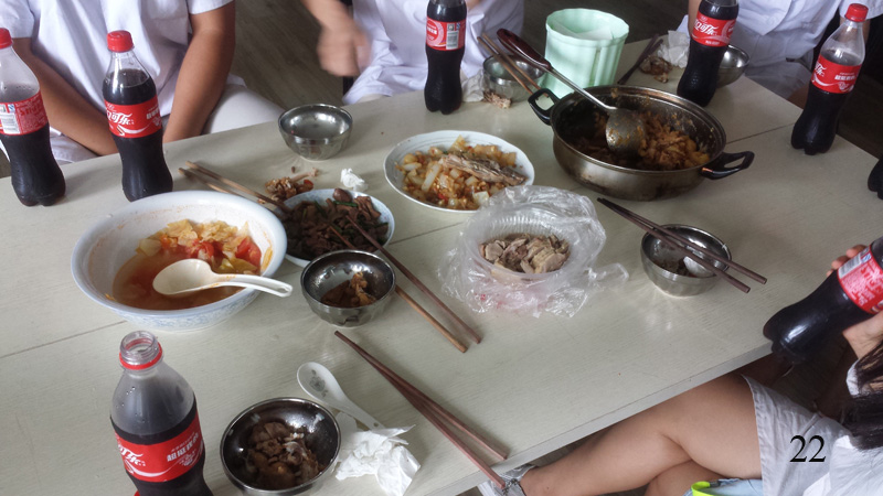V polední přestávce byl na klinice „na moji počest“ něco jako slavnostní oběd. Menu se skládalo z kachního masa, kachních vnitřností, vepřových kousků s bramborem, zeleninové huspeniny a rýže, plus zeleninová polévka. Vše mělo rozličnou chuť a vše chutnalo naprosto skvěle (obr. 22). Sedělo nás deset lidí u stolu a všichni ke mně měli krátkou řeč ve smyslu, že mně přejí do další práce mnoho úspěchů apod. Bylo to docela dojemné, místo přípitku jsme si ťukli miskou s rýží. Ani nevím, jestli to je běžné nebo se jen z důvodu nepřítomnosti alkoholu improvizovalo. Všem jsem najednou krátce poděkoval a řekl, že si vážím toho, že jsem s nimi mohl strávit dva týdny v přátelské atmosféře a že jsem se mohl něco nového přiučit a že veškeré načerpané znalosti úspěšně využiji doma ve své práci.