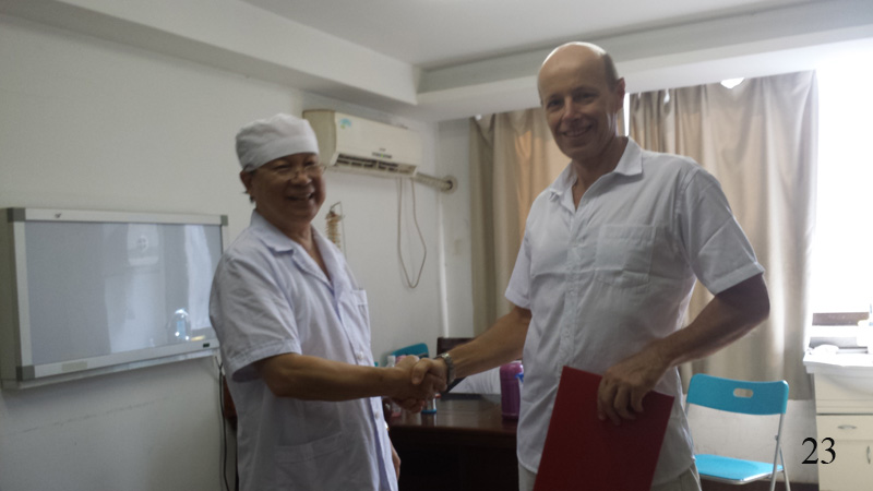 Ráno jsem se zeptal profesora jestli můžu na klinice pro svoji potřebu natáčet na kameru a neměl nic proti. Obešel jsem si to tam s malou sportovní kamerou dokola, natočil ho při akupunktuře a zaznamenal zdejší ranní dění. (Video vyšlo naprosto famózně, vůbec bych nečekal, co taková kamera zvládne. Jen zvuk je trochu zastřený.) Po zaplacení poplatku za stáž (3800 yuan) mi slavnostně předal certifikát (obr. 23), který napsal do vytištěného formuláře přede mnou ručně propisovacím perem, i když ještě včera sliboval, že to nechá napsat silnějším štětcem, aby to mělo ráz grafického díla. K tomu jsem dostal „dárek“, což byla z barevných korálků postavená jakási podivná postavička. (Tuto jsem pak nechal na hotelovém pokoji, protože by mi zabírala zbytečně místo v kufru a navíc se mi pranic nelíbila.) Ještě jsme si všichni spolu udělali společné foto a bylo asi 9.30 hod., kdy jsem vycházel naposledy z kliniky.