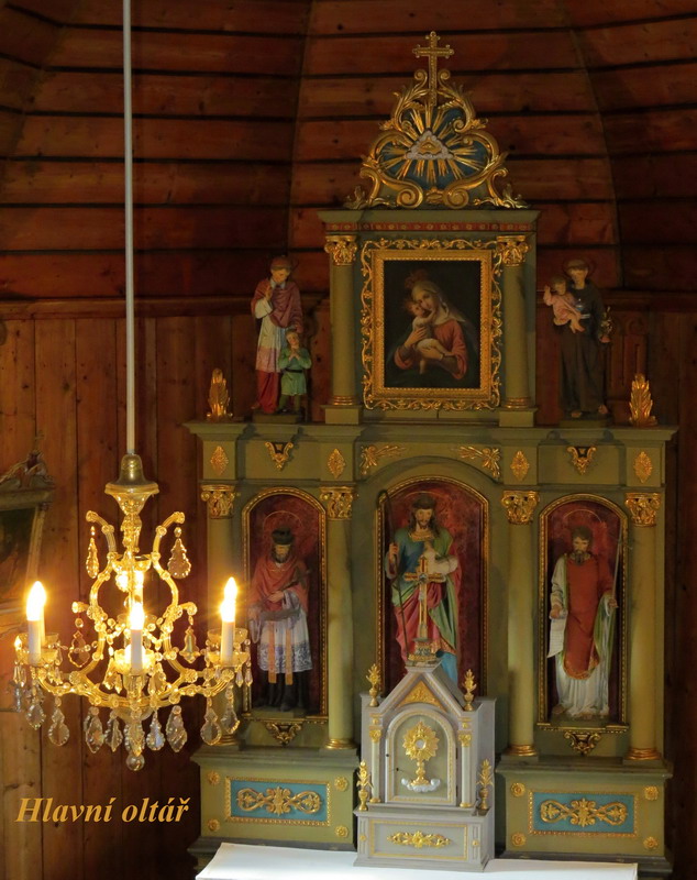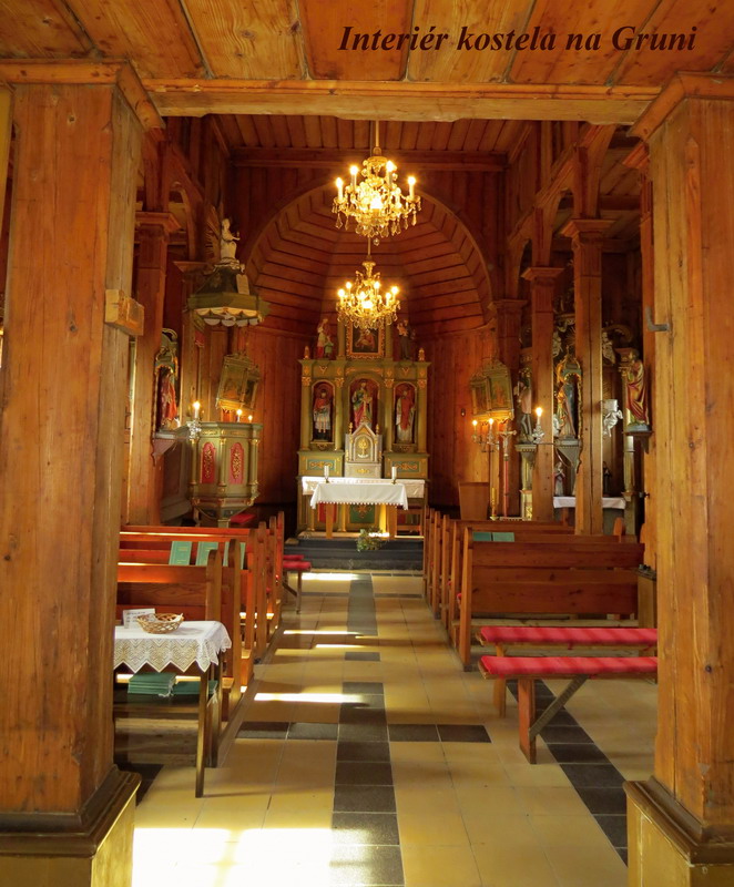 Grůni. Klíče od něj jsou uloženy v Domě u svatého Josefa, kousek od památky, a po domluvě vás zdejší majitelé kostelíkem rádi provedou. Je to moc pěkný svatostánek, určitě bychom doporučili zajet se k němu podívat, protože je tu krásná atmosféra, podbarvená místní lidovou tradicí. I pro děti mají tyto kostely svoje kouzlo, jsou prostě takové pohádkové, a když si člověk ještě představí závěje sněhu venku, tmu všude vůkol a uvnitř rozžaté svíce, tak se mu také zdá, že se i on přenesl do nějaké lidové pověsti či pohádkového příběhu. Jaká krása se může skrývat v jednoduché prostotě a jakou marnost občas představují některé pompézní církevní stavby.