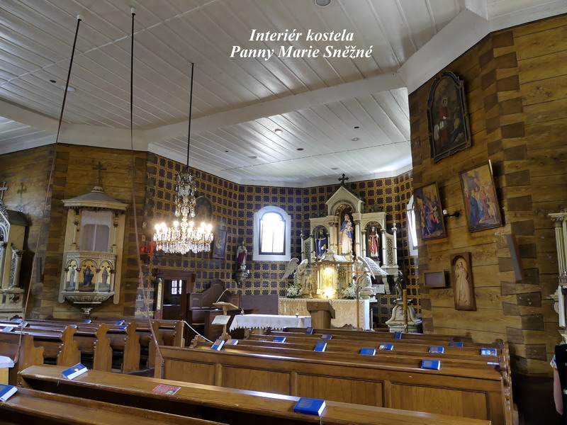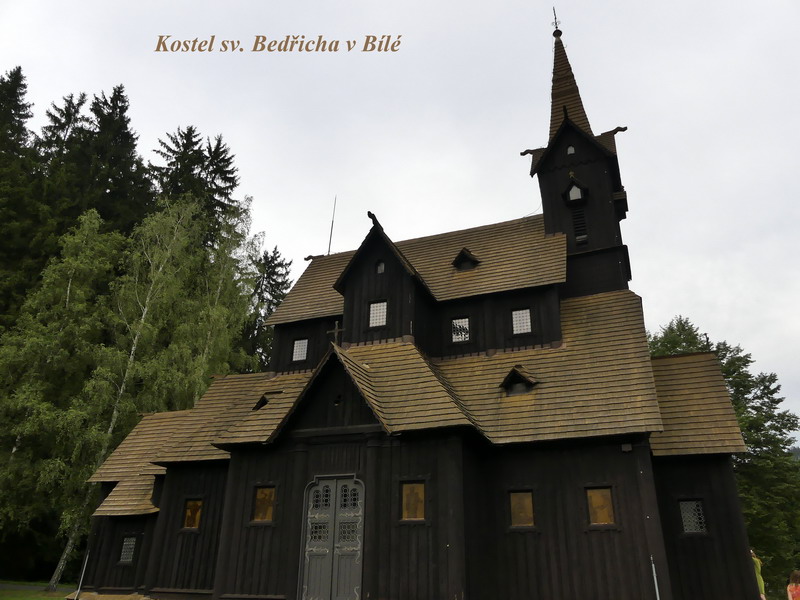V podvečer téhož dne jsme se ještě domluvili s místní paní průvodkyní, že nám přijde otevřít dřevěný kostel, vedle kterého jsme byli ve vesnici Bílá ubytováni. Je to poměrně velký chrám s krásnou výzdobou a neuvěřitelně šťastným osudem. Původně to byl totiž tento kostel, který si vybrali žháři z Ostravy, že by ho mohli zapálit. Až tady jsme si vyslechli celý ten příběh, ve kterém opravdu nešlo jen o takové nějaké nahodilé lhářství pod vlivem alkoholu, ale že si pachatelé dopředu vybírali z těchto dvou kostelů (v Bílé a v Gutech), který zničí. Svatostánek v Bílé měl to štěstí, že se tam zrovna prováděla nějaká menší rekonstrukce, a přitom někdo z místních ty hošany zahlédl, a z blízkosti kostela je vyhodil. No a tak se tedy rozhodli zapálit raději kostelík v Gutech.