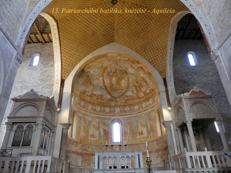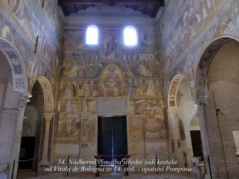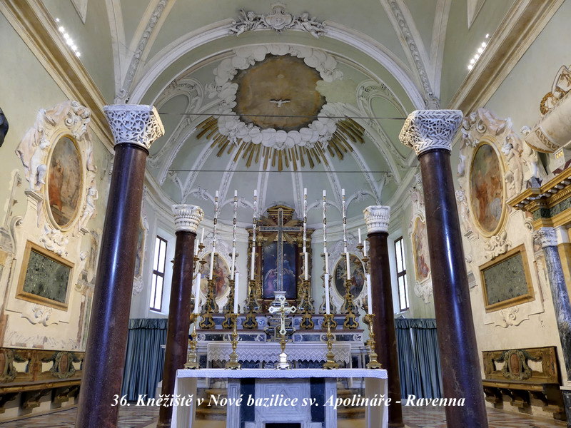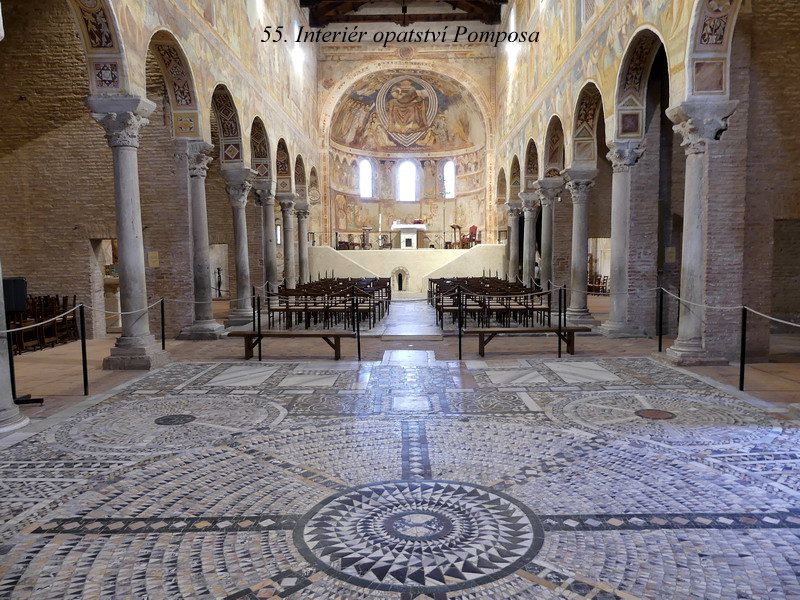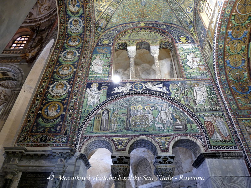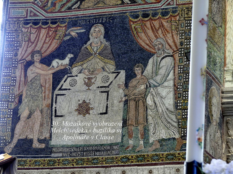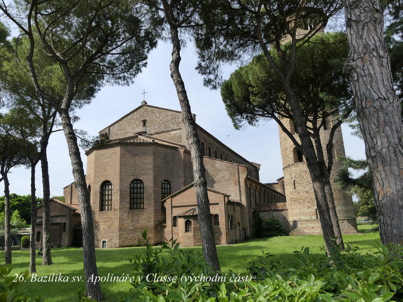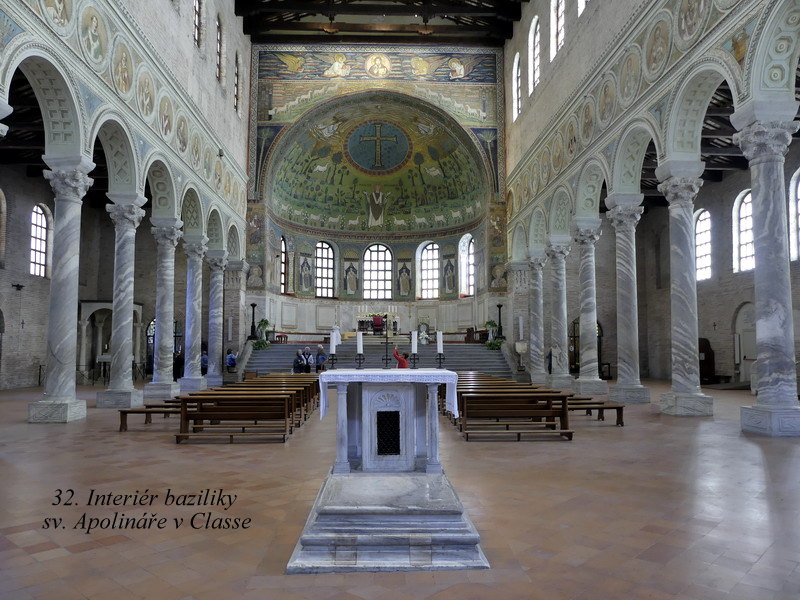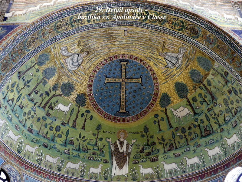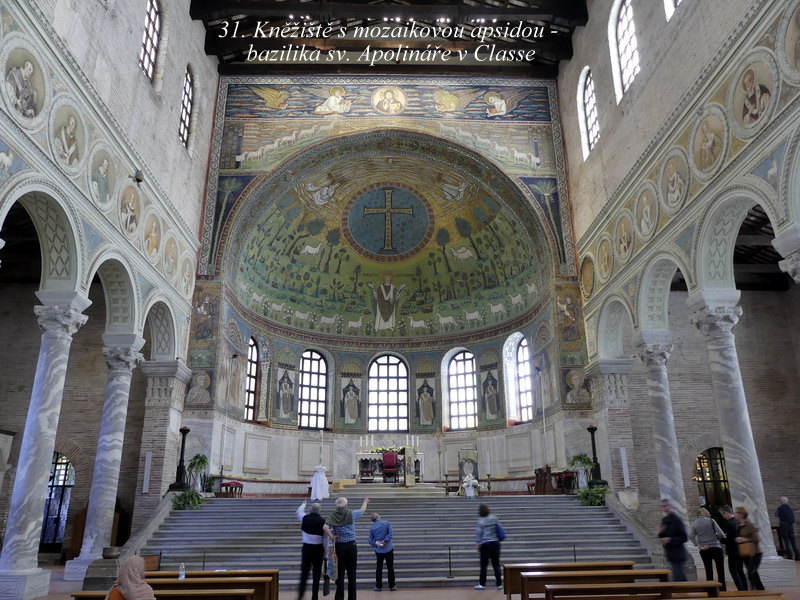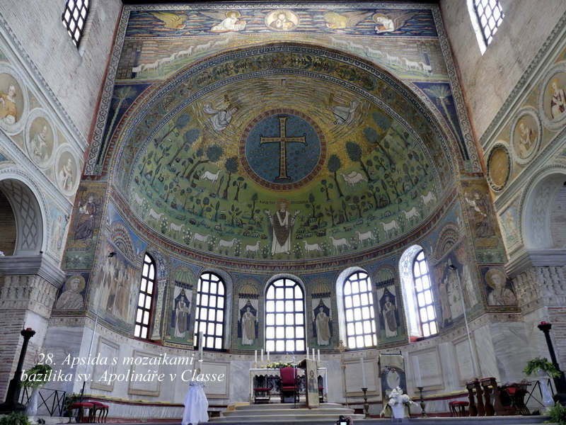 Sant´ Apollinare in Classe. Mně osobně se tento svatostánek líbil asi zdaleka nejvíce ze všech kostelů v Ravenně, asi pro jeho architektonickou harmonii a souladnou vnitřní výzdobu. Hlavní mozaika chrámu je skvostná, jsou zde zobrazena nejstarší biblická témata, včetně kněze Melchisedecha a dalších motivů z knihy Genesis.