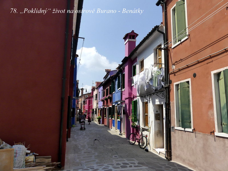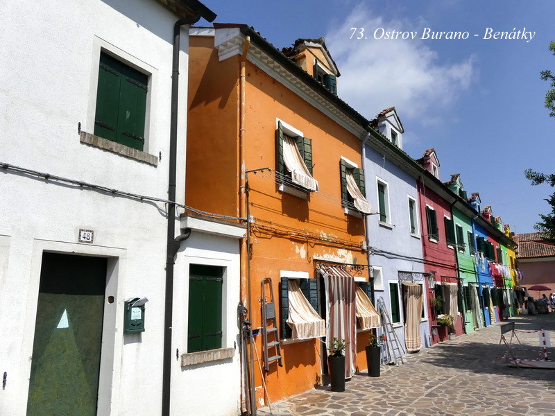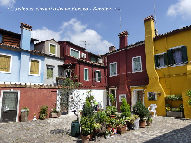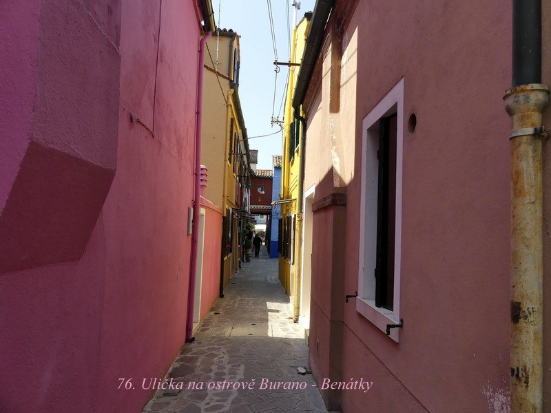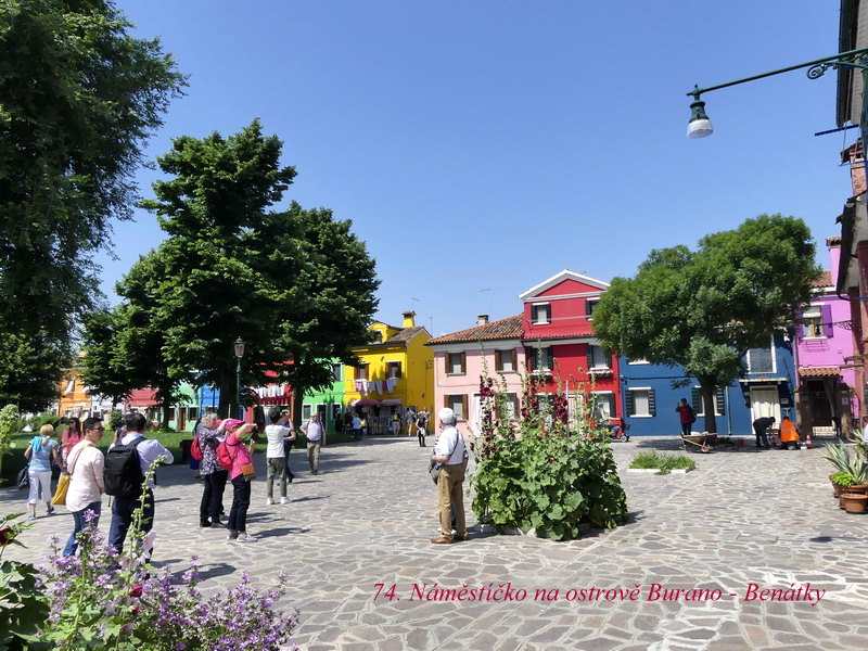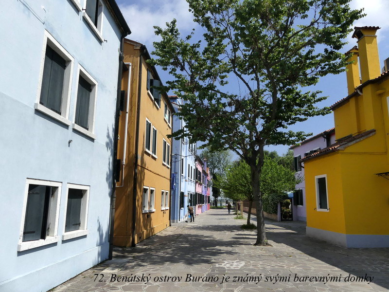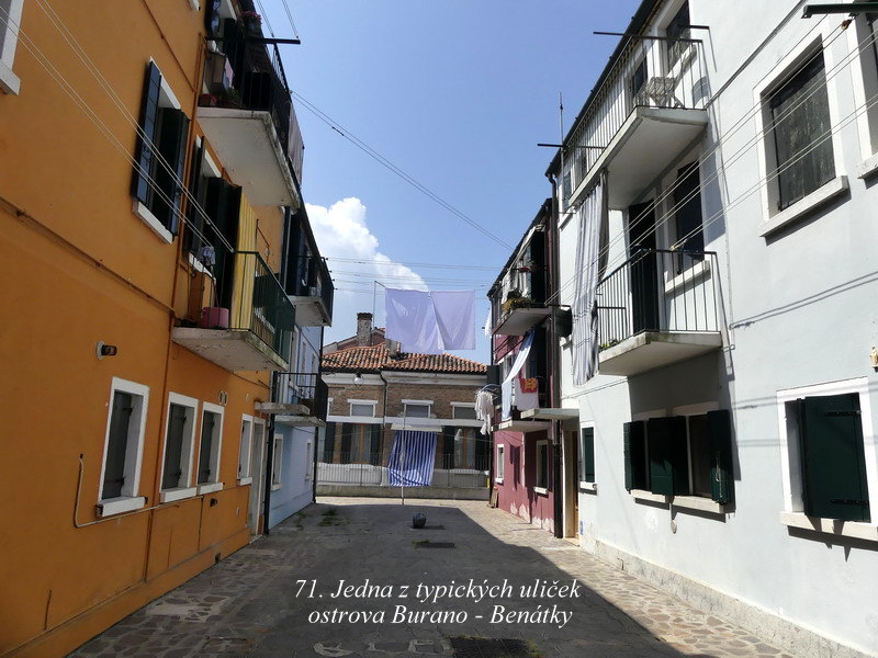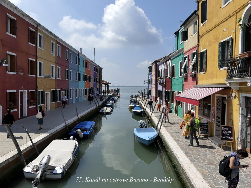 Ostrov bližší k Benátkám se nazývá Murano a po staletí ho obývali proslulí mistři skláři. O něco vzdálenější je pak podobně znějící ostrov Burano, a tam se zase věnovali výrobě skvostných krajek. No, my jsme se tam jenom krátce prošli po uličkách plných barevných domečků a pak už jsme pokračovali dál lodí na ostrov Torcello.