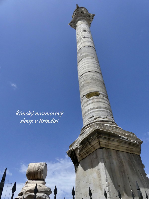 Více než městečko Lecce nás zaujal přístav Brindisi, velmi významný ve starověku, v němž končila antická silnice Via Appia. Dva mohutné sloupy, lemující schodiště do přístavu, označovaly místo, odkud vyplouvaly římské lodě pod velením císařů dobývat Blízký Východ, stejně jako o tisíc let později, kdy zde zvedali kotvy křižáci, mířící do Svaté země. Zdejší monumentální schodiště, otevírající se do promenády, nese jméno básníka Vergilia, který zde zemřel po svém návratu z Atén.