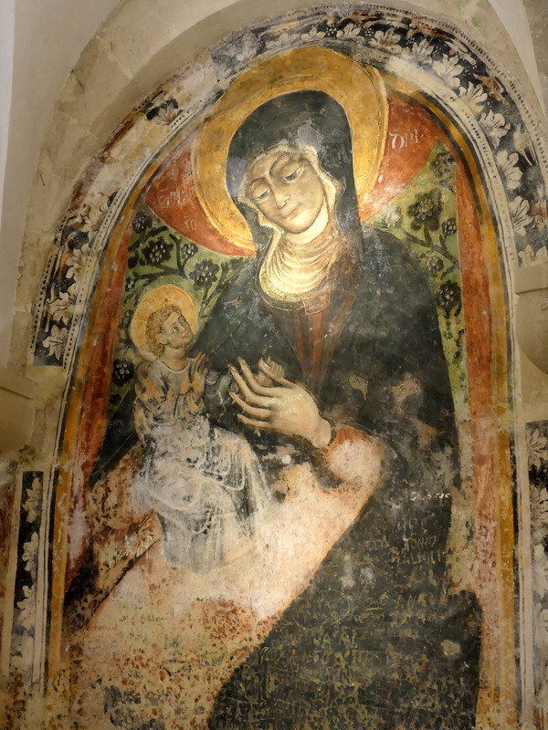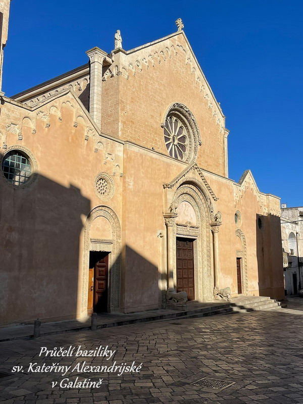 Při zpáteční cestě z Leucy do našeho ubytování jsme se vraceli skrze vnitrozemí, protože jsme měli v úmyslu zastavit se ještě ve městečku Galatina a prohlédnout si zdejší románskou katedrálu Santa Caterina d´Alessandria, jejíž zdi zdobí krásné fresky ze 14. století. Galatina přitom není sama o sobě nijak zvlášť výjimečným městečkem, ale zdejší katedrála je opravdu velmi pěkná. V jejích prostorách se nachází i malinké muzeum, které ukrývá předmět mimořádně silně duchovně vyzařující. Jedná se o mozaikovou ikonu Krista vytvořenou mikroskopickými kamínky, což je už samo o sobě mistrovské dílo. Navíc ovšem ikona, byť ukrytá pod bezpečnostním sklem, vyzařuje velmi silnou energii, léčivou a harmonizující. Ikona byla přivezena z Konstantinopole ještě před jejím dobytím Turky a mně osobně jenom potvrzuje můj dojem z našich cest, že východní křesťanské církve v sobě ukotvují duchovně silnější pramen původního Evangelia. Pro mne byl pohled na tuto ikonu tím nejsilnějším duchovním zážitkem, který jsem si z cesty po Apulii domů přivezla.