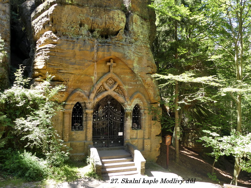 Co je ale vůbec v tomto kraji zajímavé, je množství různých pískovcových skal, do kterých byly dřívějšími kameníky vytesány někdy až neuvěřitelné reliéfy a působivé prostory. Právě na hradě Sloup je jedna taková kaple, a ještě větší skvost je ukryt právě v Modlivém dole. Ke kapličce vede křížová cesta, po které v dřívějších dobách kráčelo velké množství poutníků, mezi nimi dokonce i poslední korunovaný český král Ferdinand Dobrotivý. Sama kaplička pak něčím trošku připomíná skalní komplex v Petře, i když předlohou měla být kaple v Lurdech. Svojí velikostí se samozřejmě kaplička nemůže s těmito významnými památkami srovnávat, ale ona se asi síla modlitby stejně neodvíjí od velikosti toho kterého chrámu, v němž právě poutník zastaví svoje kroky. I návštěva malé kapličky, vyzdobené květinami prostých věřících, může přinést člověku poklid na duši a útěchu v jeho trápení. A právě k takovým místům kaplička v Modlivém dole určitě patří.