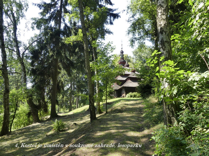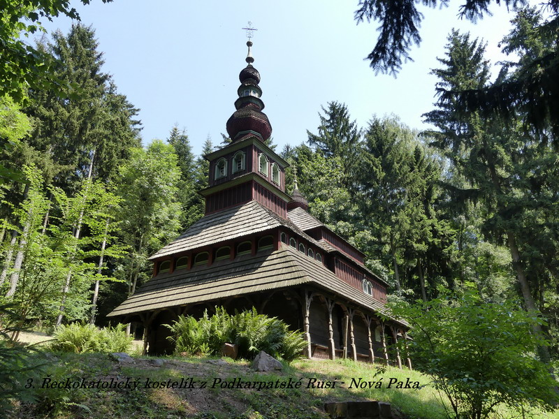 Naše putování jsme začali v brzkých ranních hodinách, protože byl před námi kus dlouhé cesty, a měli jsme opět štěstí na volný silniční provoz, neboť většina našich spoluobčanů mířila v první prázdninové dny spíše na jih k moři než na sever naší republiky. Po krátké zastávce ve městě, kde se zrodil jeden z našich nejpěknějších večerníčků o ševci Rumcajzovi, jsme dorazili až do Nové Paky, kde jsme měli domluvenu první prohlídku. Na okraji tohoto městečka totiž stojí jeden ze tří dřevěných kostelů, které byly do naší republiky dovezeny v minulém století z Podkarpatské Rusi. Jedná se o kostelík zasvěcený sv. Mikuláši a původně patřil řeckokatolické církvi. Do republiky se dostal tím způsobem, že ho místní pan továrník zakoupil v době, kdy měla být tato stavba ve své domovině stržena a nahrazena novou kamennou. Později pan továrník zemřel na následky mučení nacisty a je v kostele i s rodinou pochovaný. V současné době je kostelík ve vlastnictví jeho syna, který prohlídky případným zájemcům stále povoluje, je ale otázkou, jak celý zdejší areál, k němuž patří i bývalý penzion pro seniory a malý lesopark, jednou dopadne. Všechny objekty zde bohužel dosti chátrají a není zřejmě vůle či možná dost peněz, aby byly restaurovány a vráceny opět do plnohodnotného provozu.