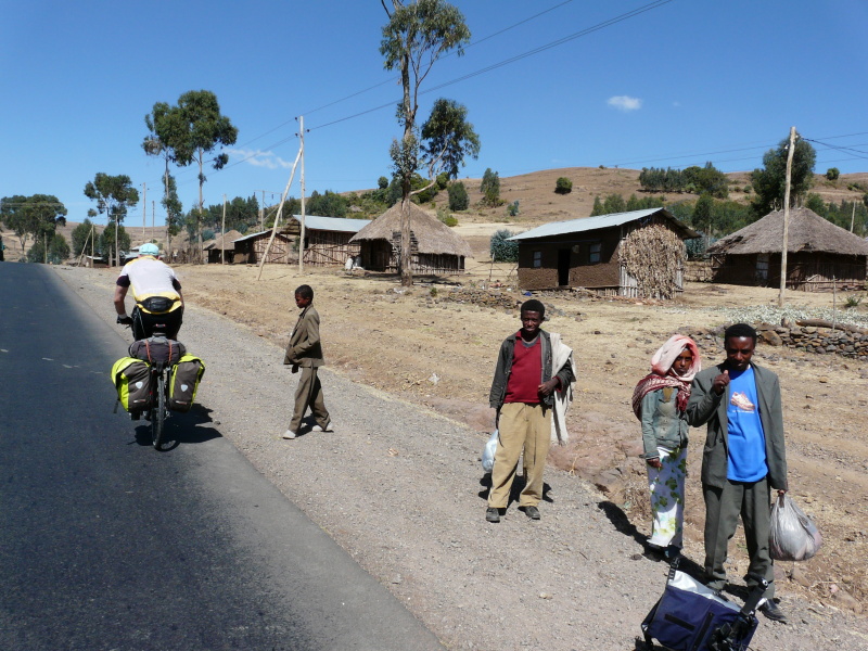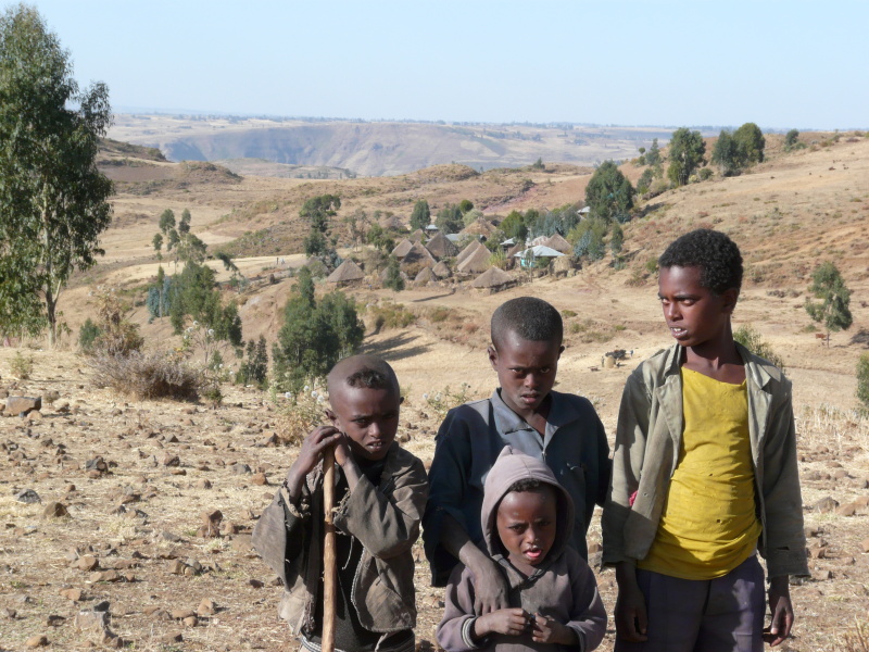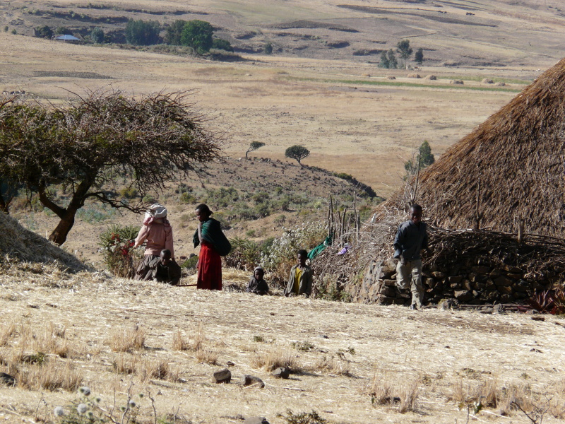 Adis Abeba leží v nadm. výšce 2350 m n.m. a silnice, kterou jsme se směrem na sever vydali, vedla neustále do kopce, aby se vyšplhala až na 3000 m n.m. Odtud už byl terén vlnitý, kousek z kopce, kousek do kopce a to stále dokola. Hned první vesnice za městem vypadala úplně přesně jako z knížek Zikmunda a Hanzelky – kruhové chýše se slaměnými střechami, odkud vybíhaly děti, škemrajíce o peníze. Na políčkách se mlátilo sklizené obilí tím způsobem, že po něm chodili v kruhu koně. Až to bylo dost pošlapané, nastoupily ženské s velkými plochými mísami, na které si nabraly vymlácenou směs a s pomocí větru oddělovaly plevy od zrna.