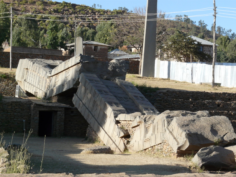 V cílovém městu Axum jsme se jeli podívat na největší turistickou atrakci – obelisky vytesané s jednoho kusu kamene, z nichž jeden kdysi ukradl Mussolini, a který Italové vrátili až v r. 2000. Já jsem osobně na nich neviděl nic moc zajímavého, ve skutečnosti jsou zahrnuty do kulturního dědictví Unesco. Největší z nich je 33 m vysoký a váží 520 tun. Byly postaveny ve 3. - 4. stol. n.l. Když si ale člověk uvědomí, s jakými pracovními prostředky a možnostmi v té době lidé disponovali, sloupy vyžadují přinejmenším obdiv nad zručností tehdejších řemeslníků. Jeden ze sloupů je spadený a rozlomený na několik kusů.