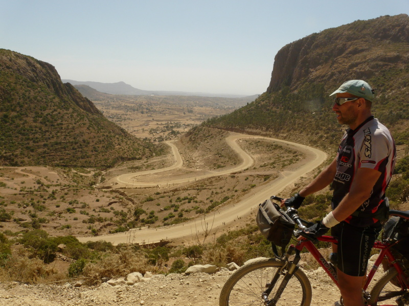 Když jsme asi v 15 hod. odpoledne vyjížděli z vesnice, kde jsme si dali své dnešní jediné jídlo (mimo snídaně) – výborné skopové s injarou a zalité jogurtem, uviděl jsem stejný obrázek jako už několikrát v předešlých dnech. Na všechny strany směrem před námi byla propast dolů a v dálce, na protějším hoře, malinká cestička vinoucí se nahoru. Na deseti km jízdy jsme spadli o 600 výškových metrů. Dole jsme potkali dvě karavany velbloudů jdoucí zřejmě pro sůl do Sudánu. Jeden z velbloudářů chtěl, abychom za to, že je fotíme, zaplatili nebo alespoň dali vodu. Ukázal jsem mu, že mám jen vodu v cyklistické láhvi. (Zásoby v taškách jsem přirozeně zatajil, protože nás teď čekalo mnoho km stoupání.) Ukázal jsem, že mu můžu alespoň z láhve nalít přímo do pusy. Kývl že ano, ale hned vodu vyprskl a křičel něco, co buď bylo v překladu „fuj“ nebo něco mnohem sprostšího. Nebylo se ani čemu divit – teplá voda z plastového bidonu, nevymývaného už několik dní, je opravdu pitelná jen ve velké nouzi.