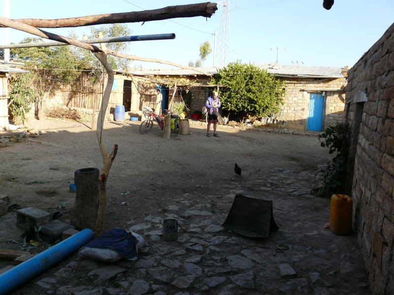 Ubytování bylo naštěstí za vraty, čímž jsme se zbavili hordy děcek a zvědavců utíkajících od krámku za námi. Jestli to byla „ubytovna“ nebo nás nechal někdo přespat u sebe netuším, ale malá komůrka byla součástí domku, kde se normálně žilo, takže spíše bych se přikláněl ke druhé variantě. Alespoň jsme měli možnost pozorovat dění v etiopské domácnosti zblízka. Na umytí byl pro nás oba jeden kýbl vody a to se ještě ošívali, že mají vody málo.