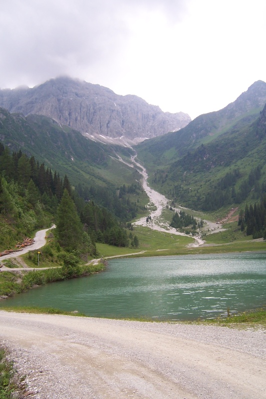 Z Obertilliachu se odbočka vlevo nedá minout, neboť hledaná cesta je ze silnice vidět do dáli a je to v podstatě jediná cesta, která tudy vede. Bohužel silnička vede nejprve dolů z kopce a člověk tak během pár desítek vteřin ztratí asi padesát těžce nastoupaných výškových metrů. V těchto místech je nádherně upravené dětské hřiště s různými atrakcemi, a protože zde nikdo nebyl, sami jsme si s radostí některé z nich vyzkoušeli. Dál už končí asfalt a vede jen šotolinová cesta. Nejprve je stoupání mírné a cesta velmi kvalitní, po několika kilometrech se oboje zhorší. Zpočátku se jede lesem, později stromů ubývá a začínají ty „pravé“ Dolomity. Ve výšce 1700 m n.m. jsme narazili na nádherné horské jezero, které není kupodivu vyznačeno ani na nejpodrobnější mapě, kterou jsme s sebou měli. Panorama je zde kouzelné – blankytně modré jezero a na pozadí strmé štíty hor. Kdyby tuto scenérii chtěl malíř realisticky zachytit na plátno, mnoha lidem by to připadalo tak neskutečné, že by to považovali za kýč. Zcela uchváceni jsme zůstali hledět a jako malé děti jsme pobíhali kolem a fotografovali okolní krajinu. Už tady jsme si říkali, že jen pro tento zážitek se naše cesta vyplatila. To jsme ještě netušili, že podobné pocity jsme v následujících třech dnech prožijeme ještě mnohokrát!