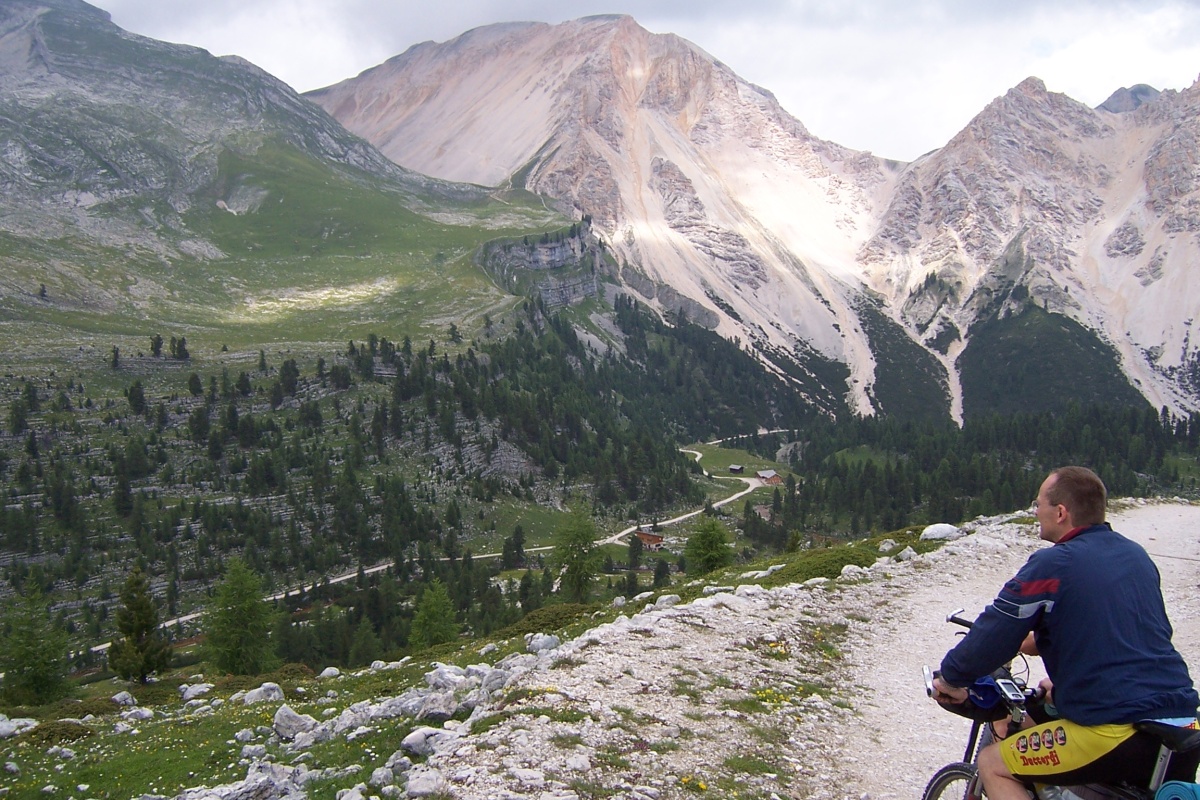 Brzy ráno jsme sjeli do Cortina d´Ampezzo (1200 m n.m.). Toto malebné město určitě stojí za samostatnou prohlídku, my zde byli však již vloni, takže jsme se nezdržovali a po krátké snídani před obchodem potravin jsme vyrazili směrem na horský průsmyk Limojoch (2159 m n.m.). Cesta je hned z města velmi dobře značena a nedá se zde zabloudit. Zprvu má charakter naučné stezky podél říčky Boite a vede souběžně se silnicí vedoucí severně na město Toblach. Stoupání není příliš příkré, je zde spousta mimořádných výhledů do okolní krajiny a člověk je tak uchvácen dílem Matky přírody, že se to ani nedá slovy popsat. Po pár kilometrech stoupání přitvrzuje a od určitého okamžiku se dá jet již jen na nejlehčí převod, kterým kolo disponuje. Stezku využívá hodně turistů s hůlkami (tzv. Nordic walking) a ani bajkeři zde nejsou výjimkou. My jsme však s objemnými taškami byli raritou. Několikrát se dokonce stalo, že jsme vyjeli některý úsek (i 23%), kde ostatní bajkeři tlačili a jejich udivené pohledy byly pro nás tím nejlepším dopingem.