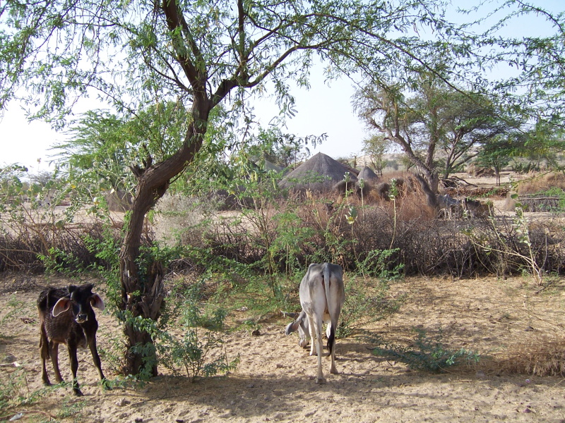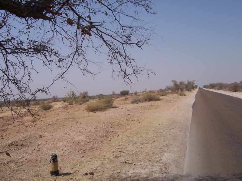 Podle mapy jsem se měl dnes konečně dostat na Radžastánskou poušť. Docela jsem se na ni těšil, neboť na podobných místech si člověk ověří a částečně i upevní nejen svoji fyzickou, ale hlavně psychickou odolnost. Představoval jsem si ji podobně jako Saharu, ve skutečnosti tu byl stále široko daleko nějaký porost. Sice nízký a suchý, ale byl, dokonce i sem tam nízké stromy. Pískových jazyků oproti předchozím dnům sice přibylo, ale pořád to nesplňovalo moji představu pravé pouště, přestože jsem minul několik maličkých vesniček s kruhovými domky a slaměnými střechami, které bych řadil spíše do Afriky než do Indie. Výrazně také přibylo velbloudů.