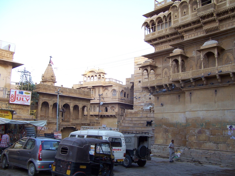 A co teprve kamenné uličky! Vše je sice přizpůsobeno turistickému ruchu – snad všude je obchod se suvenýry – ale úžasnou atmosféru to nezmění. Poprvé a naposledy mně ani nevadily mraky turistů, kteří město Jaisalmer vyhledávají jako jednu z největších atrakcí Radžastanu. Motorovým vozidlům je vjezd až na výjimky do pevnosti zakázán, nehledě na to, že většina uliček je natolik úzká, že by jimi normální auto sotva projelo. Domy jsou neuvěřitelně krásně vyzdobeny a oproti ostatním indickým domům mají často nádherně zdobené vikýře a balkóny. Vše je postaveno ze žlutého pískovcového kamene, ne náhodou se proto Jaisalmeru přezdívá „Zlaté město“. Jediné, co se dá pevnosti lehce vytknout, je stejně jako v ostatních indických městech všudypřítomný pach moče. Jestli je to tady jen od volně se popocházejících se krav a psů nebo i od lidí, nedokážu posoudit, v každém případě jsem byl i tak ze všeho nadšený, že jsem samým vzrušením jen velmi těžko usínal.