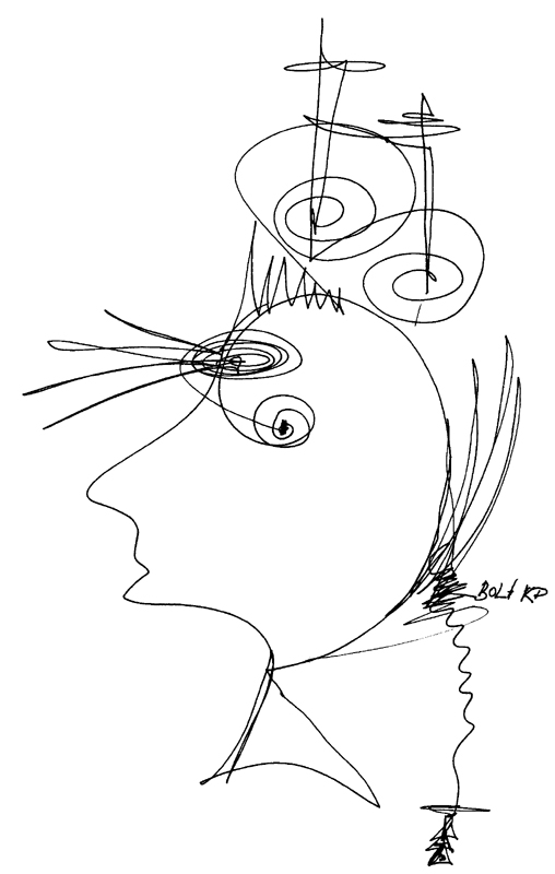 Člověk vysílající pozitivní myšlenky. Ztrátu energie mu způsobuje bolest krční páteře, která v tomto případě nemá s myšlenkami nic společného.