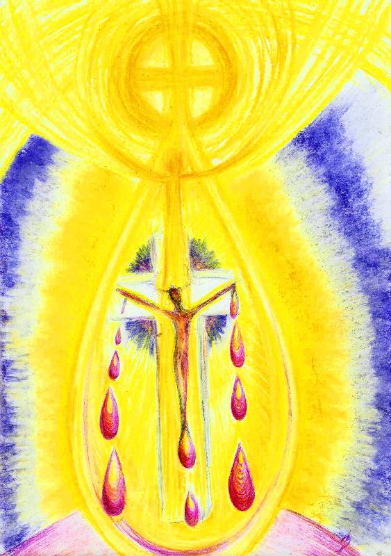 Slza života, která z velké Lásky Otce dopadá na náš svět v podobě Syna a omývá ho svou září a principem - Svým tělem a krví, kterou smývá vše, k radosti a naději nového života, v Jeho Vzkříšení … „