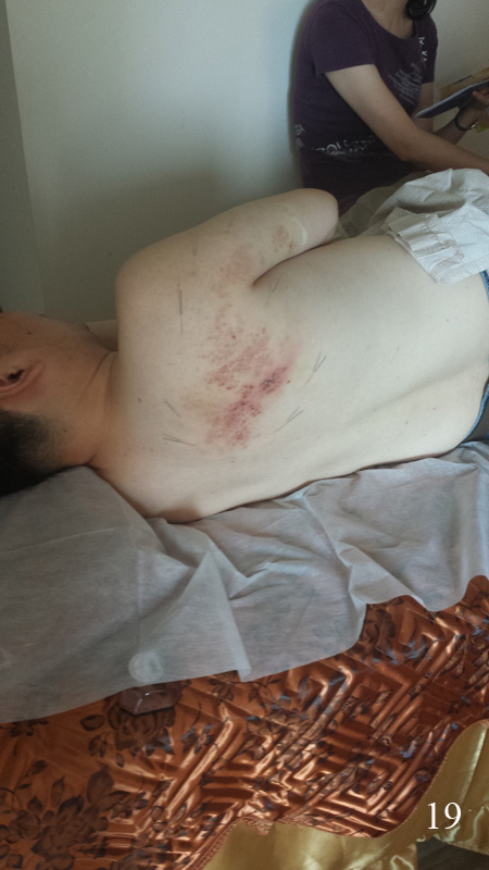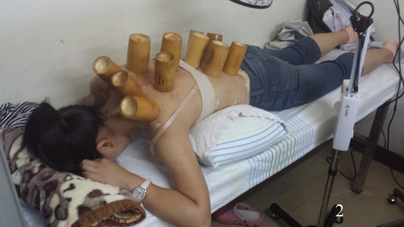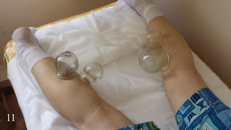 U léčení se nic nezměnilo, jen přibylo pár nových případů, z nichž pro mě nejpřínosnějšími byly dvě mladé ženy a amenorheou (bez menstruace), kostní výrůstky na kolenu a tichá vysušená žena středního věku, která mělo od sucha v ústech, přes suchou kůži a zácpu, suché úplně všechno. Zajímavé bylo i léčení varixů (křečových žil) akupunkturou – největší uzlíky se rozpíchaly jehlou (tato vypadala jako propiska) a pak se na ranky přisála baňka. Pod baňkou pak pod tlakem z malých ranek začala téct krev (obr. 11). Bohužel nevím, jak moc je to úspěšná metoda a na jak dlouho je případné léčení, chlapík zde byl po prvé a nohy měl plné křečových žil. Ani jsem se neodvážil zeptat se na to mé tlumočnice, určitě by nebyla schopná pochopit, na co se ptám. I tak byla zase dnes velmi slabá a já se proto snažil mluvit co nejméně a jen jsem poslouchal a koukal.