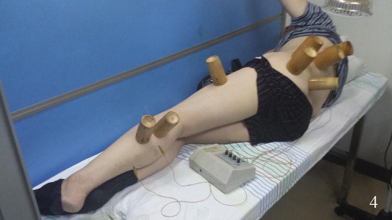 Nemocnice byla oproti včerejší klinice celkem luxusní, ale i tady už čekala spousty lidí s pořadovými lístky v ruce. Ordinací zde bylo ještě více než včera, léčba však probíhala úplně stejně jak už jsem zažil – všechny lidi vyšetřoval, navrhoval léčbu, psal recepty a napichoval jehly pouze sám profesor, ostatní doktoři mu byli jen k ruce. Tj. přikládali na určená místa baňky (obr. 2), zapalovali moxu (obr. 3) nebo přikládali na jehly elektrostimulaci (obr. 4).