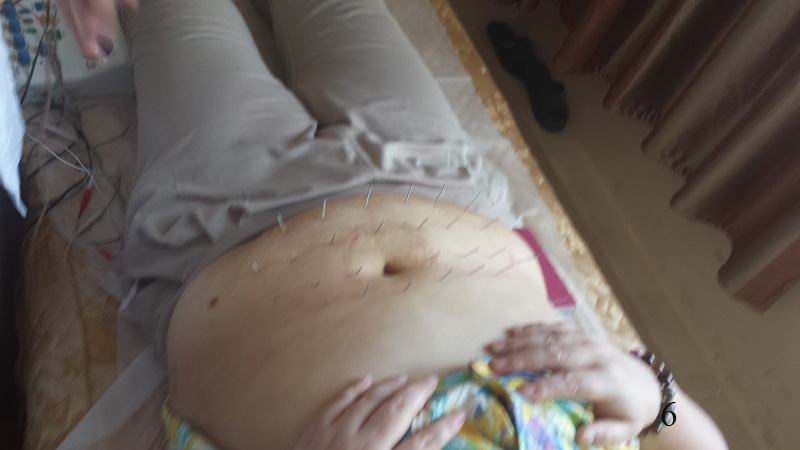 Když jsem se zde trochu více rozhlížel a zjistil jsem, že všichni doktoři i dva doktorovi studenti samostatně pracovali. Normálně píchali jehly a všechno ostatní, co k tomu zde dělají. Podle mě ale samostatně nediagnostikovali, jen ošetřovali ty, kteří sem chodí opakovaně a kterým se zavádějí jehly do stále stejných bodů. Např. jedna paní s obrnou lícního mi říkala, že sem chodí už dva měsíce třikrát týdně, stav se jí o hodně zlepšil (i když obrna byla na jejím obličeji stále ještě trochu znát) a že poslední dva týdny jí píchají i jehly na zhubnutí (obr. 6). Již ztratila 5 kg, přestaly jí otékat nohy a konečně dobře spí.