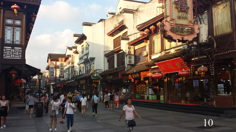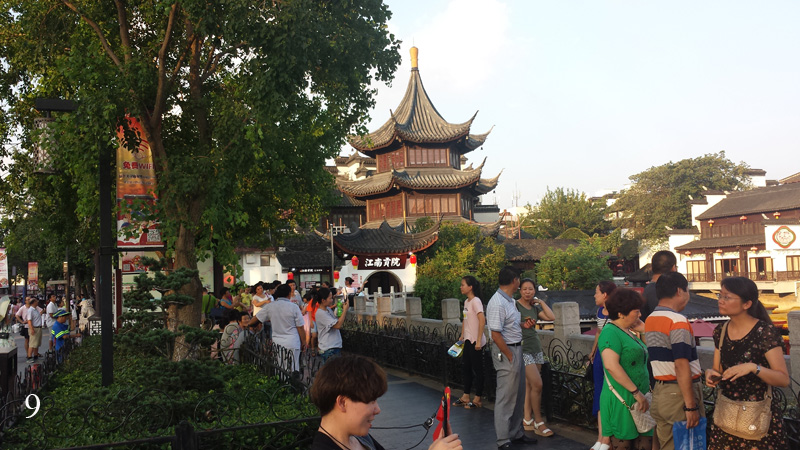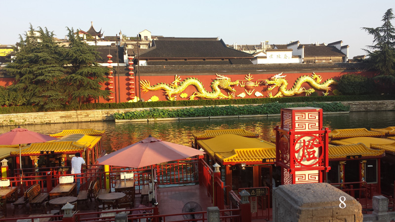 V pět hodin odpoledne jsem konečně vylezl ven a vyjel na prohlídku Konfuciova chrámu, který je od hotelu jen pár zastávek metrem a který jsem měl doporučený z několika stran. Lístek, resp. modrý žeton jsem si už zvládl koupit sám (2 yuan) a i s přestupem jsem byl na místě asi za 20 minut. Komplex Konfuciova chrámu je obrovský, kromě dvou opravdových chrámů (kde se platí vstup 25 yuan) to jsou jen uličky mezi starobylými domy a dvěmi říčkami, ve kterých jsou natěsnány vedle sebe restaurace a obchody. Nebudu přehánět, když napíši, že zde byly stovky větších či menších restaurací, o něco málo méně obchodů s předraženými tretkami a suvenýry a také značkových obchodů s ještě více předraženými hadrami a botami. Všude kolem chodilo tisíce čínských turistů, kteří jedli, pili, nakupovali a byli docela hluční, bělocha jsem nepotkal ani jednoho. (Obr. 7 – 10)