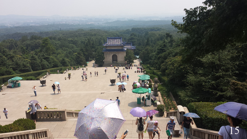 Podle plánku jsem jel asi 5 stanic metrem (2 yuan), pak jsem měl nastoupit na vyhlídkový autobus a dojet až k mauzoleu. Jenže autobusová zastávka nebyla hned u východu z metra, tak jsem chvíli stál a koukal na velkou ceduli s plánkem okolí. Asi po minutě se u mě zastavila mladá Evropanka, aby také koukala střídavě do své mapy a na ceduli. Dali jsme se do řeči a rozhodli, že když máme stejný cíl, budeme ho hledat spolu. Nakonec to nebylo nic těžkého, vyhlídkový autobus stál skoro za rohem, byl to asi desetimístný, otevřený autokar a jízdenka stála 10 yuan. Cesta trvala asi 5 minut, za normálního počasí by se to dalo jít i pěšky, i když to celé vedlo do kopce.