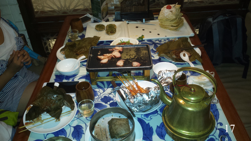 Obrovská restaurace byla v 9. patře luxusního nákupního střediska a praskala ve švech. Číšníci nám začali nosit postupně různá jídla a pochutiny. Začalo to krevetami, přes rozličné úpravy a chuti různých mas a nějaké nedefinovatelné, ale výborné sladkokyselé „mořské plody“ (vypadaly jako rosol). Pak přišla na řadu žabí stehýnka (chutnala jako kuřecí, akorát měla více kostí), různě upravené zeleniny až po nějakou sladkost plněnou ovocem. Bylo toho tolik, že se to nedalo ve třech lidech v žádném případě sníst. Tak jak je v čínské restauraci často zvykem, vždy nám to přinesli na jednom talíři nebo tácku a my si pak z něj brali, kolik jsme chtěli. Myslím, že to bylo celkem 15 různých chodů (obr. 17). Neodvažoval jsem se pomyslet na to, kolik to bude stát, ale zahlédl jsem účet, kde bylo napsáno 251 yuan, což by byla vzhledem k množství a kvalitě úplná láce. Moc se mi to ale vzhledem k cenám v obyčejných uličních restaurací za jedno jídlo nezdá. O přispění na zaplacení nechtěla Huang ani slyšet, prý to nebylo nijak drahé. To, co se nedojedlo, si nabrala děvčata do připravených plastových krabiček a vzala s sebou. Přejedl jsem se až moc a to stejné, ale s jinými specialitami, nás prý čeká zítra jako rozlučkový oběd s profesorem.