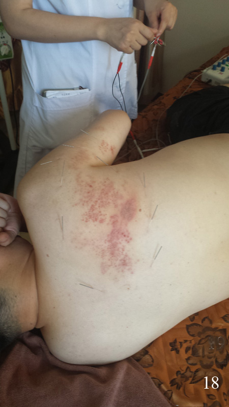 3. Doktor jakž takž dodržuje desinfekci bodů před napíchnutím, ale klidně holou rukou osahává chlapíka s pásovým oparem přímo na místech vřídků a pak, bez umytí rukou, jde hned k dalšímu pacientovi. Mimochodem tvrdil, že u tohoto onemocnění je úspěšnost akupunktury naprosto stoprocentní a že pásový opar lze tak vyléčit za kratší dobu a bez následných postherpetických bolestí oproti klasické léčbě. Tzn. že při akupunktuře se nemusí podávat antivirotika! (Obr. 18 – 20, foceno v průběhu jednoho týdne.)