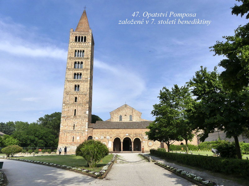 Abbazia di Pomposa. V podvečerním čase už zde bylo liduprázdno, i když v jiných dnech se tu konají různé slavnosti a pouti, hojně navštěvované místními lidmi. Původní benediktinský klášter kdysi v tomto kraji spravoval rozlehlé vinice, ale po přeložení ramene řeky Pádu mniši pro zamoření kraje malárií místo nakonec opustili. My jsme v čase naší návštěvy zvýšené množství komárů nezaznamenali, ale vzhledem k tomu, že je zdejší kraj doslova prostoupen různými mokřinami a jezery, může být jejich přítomnost jindy asi o dost výraznější.