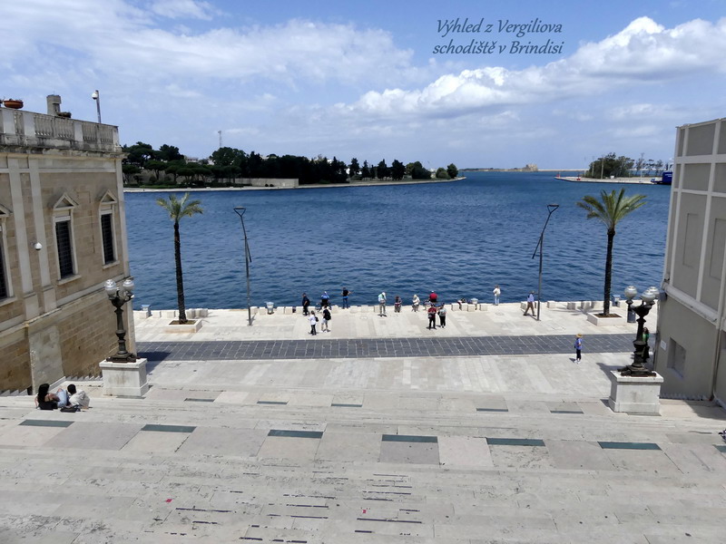 Více než městečko Lecce nás zaujal přístav Brindisi, velmi významný ve starověku, v němž končila antická silnice Via Appia. Dva mohutné sloupy, lemující schodiště do přístavu, označovaly místo, odkud vyplouvaly římské lodě pod velením císařů dobývat Blízký Východ, stejně jako o tisíc let později, kdy zde zvedali kotvy křižáci, mířící do Svaté země. Zdejší monumentální schodiště, otevírající se do promenády, nese jméno básníka Vergilia, který zde zemřel po svém návratu z Atén.