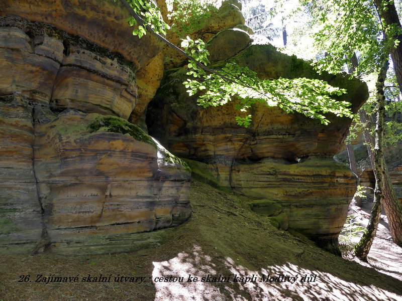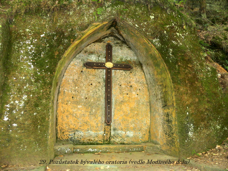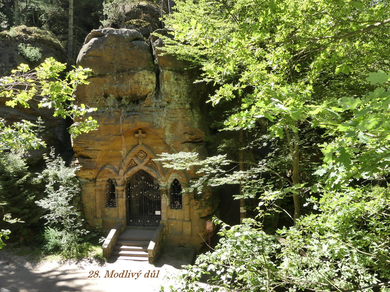 Co je ale vůbec v tomto kraji zajímavé, je množství různých pískovcových skal, do kterých byly dřívějšími kameníky vytesány někdy až neuvěřitelné reliéfy a působivé prostory. Právě na hradě Sloup je jedna taková kaple, a ještě větší skvost je ukryt právě v Modlivém dole. Ke kapličce vede křížová cesta, po které v dřívějších dobách kráčelo velké množství poutníků, mezi nimi dokonce i poslední korunovaný český král Ferdinand Dobrotivý. Sama kaplička pak něčím trošku připomíná skalní komplex v Petře, i když předlohou měla být kaple v Lurdech. Svojí velikostí se samozřejmě kaplička nemůže s těmito významnými památkami srovnávat, ale ona se asi síla modlitby stejně neodvíjí od velikosti toho kterého chrámu, v němž právě poutník zastaví svoje kroky. I návštěva malé kapličky, vyzdobené květinami prostých věřících, může přinést člověku poklid na duši a útěchu v jeho trápení. A právě k takovým místům kaplička v Modlivém dole určitě patří.