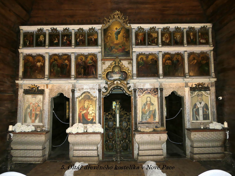 Naše putování jsme začali v brzkých ranních hodinách, protože byl před námi kus dlouhé cesty, a měli jsme opět štěstí na volný silniční provoz, neboť většina našich spoluobčanů mířila v první prázdninové dny spíše na jih k moři než na sever naší republiky. Po krátké zastávce ve městě, kde se zrodil jeden z našich nejpěknějších večerníčků o ševci Rumcajzovi, jsme dorazili až do Nové Paky, kde jsme měli domluvenu první prohlídku. Na okraji tohoto městečka totiž stojí jeden ze tří dřevěných kostelů, které byly do naší republiky dovezeny v minulém století z Podkarpatské Rusi. Jedná se o kostelík zasvěcený sv. Mikuláši a původně patřil řeckokatolické církvi. Do republiky se dostal tím způsobem, že ho místní pan továrník zakoupil v době, kdy měla být tato stavba ve své domovině stržena a nahrazena novou kamennou. Později pan továrník zemřel na následky mučení nacisty a je v kostele i s rodinou pochovaný. V současné době je kostelík ve vlastnictví jeho syna, který prohlídky případným zájemcům stále povoluje, je ale otázkou, jak celý zdejší areál, k němuž patří i bývalý penzion pro seniory a malý lesopark, jednou dopadne. Všechny objekty zde bohužel dosti chátrají a není zřejmě vůle či možná dost peněz, aby byly restaurovány a vráceny opět do plnohodnotného provozu.