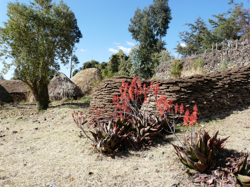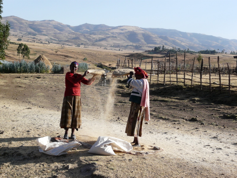 Adis Abeba leží v nadm. výšce 2350 m n.m. a silnice, kterou jsme se směrem na sever vydali, vedla neustále do kopce, aby se vyšplhala až na 3000 m n.m. Odtud už byl terén vlnitý, kousek z kopce, kousek do kopce a to stále dokola. Hned první vesnice za městem vypadala úplně přesně jako z knížek Zikmunda a Hanzelky – kruhové chýše se slaměnými střechami, odkud vybíhaly děti, škemrajíce o peníze. Na políčkách se mlátilo sklizené obilí tím způsobem, že po něm chodili v kruhu koně. Až to bylo dost pošlapané, nastoupily ženské s velkými plochými mísami, na které si nabraly vymlácenou směs a s pomocí větru oddělovaly plevy od zrna.