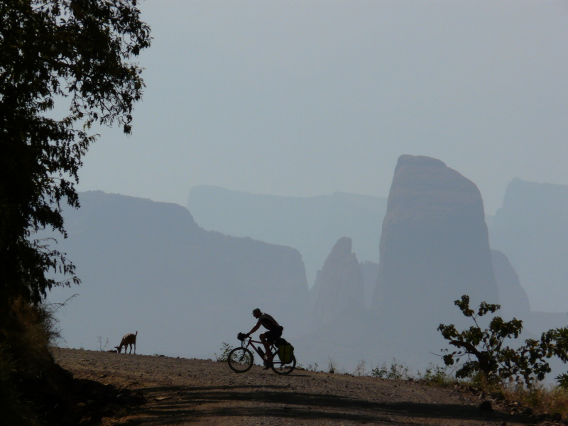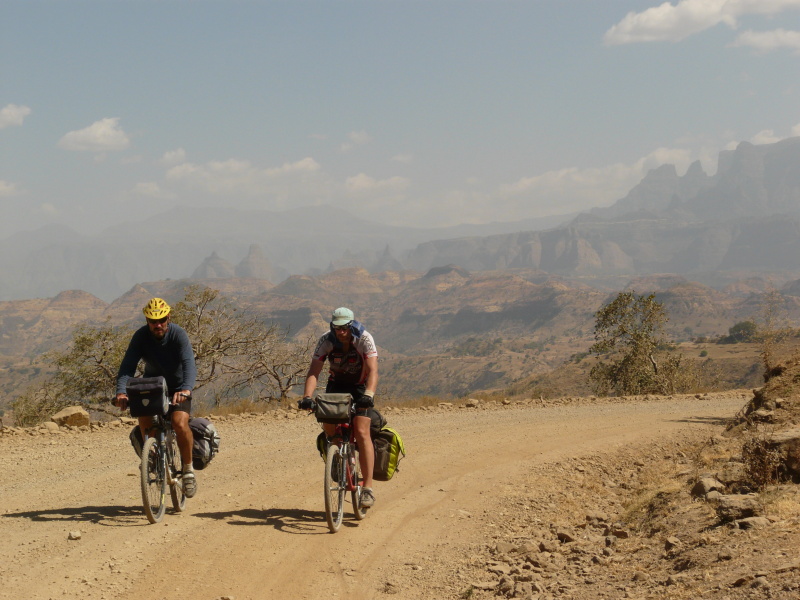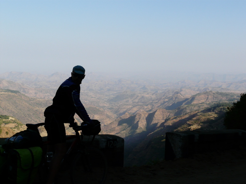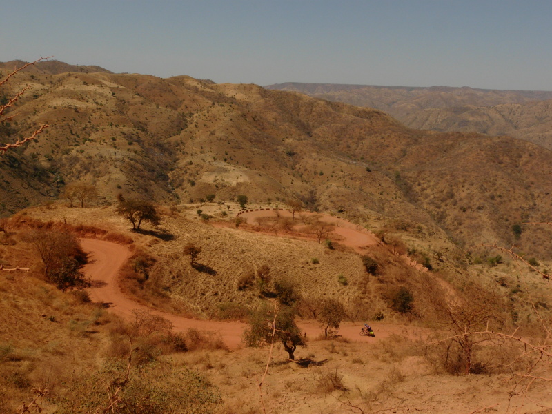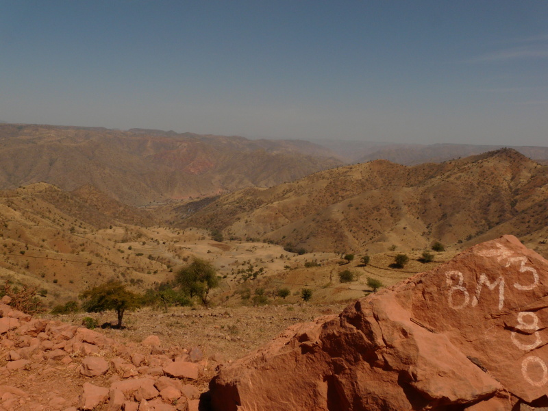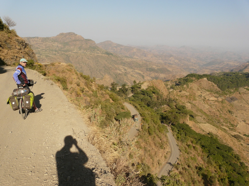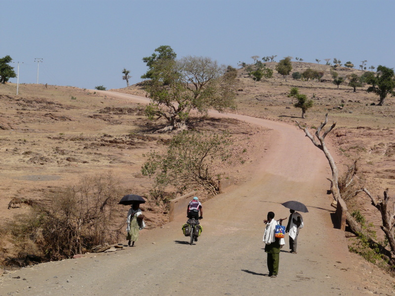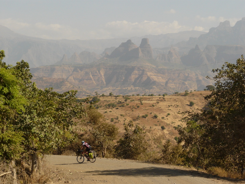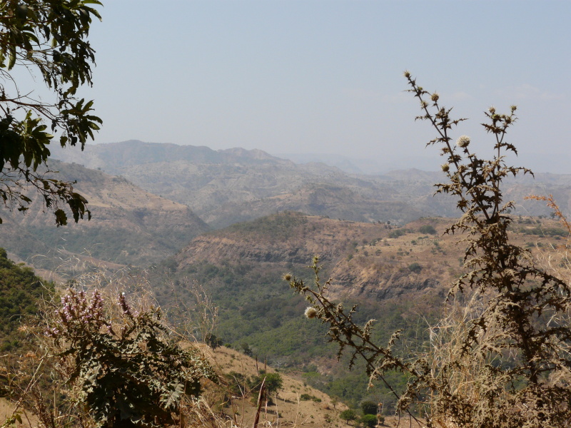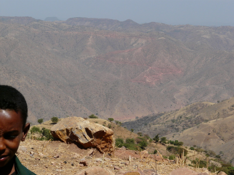 Během dalšího dopoledne jsme neustále pendlovali mezi výškou 1400 až 2000 m n.m., kde výhledy do okolí byly naprosto fenomenální. Po pravé straně bylo na obzoru rozeklané pohoří národního parku Simien, po levé straně oblé kopce, řídce porostlé stromy. Cesta nevedla bohužel po hřebenu, ale několikrát překročila další a další horský masív. Povrch cesty se oproti minulým dnům hodně pohoršil – v serpentinách byla hluboká prachová moučka, která v sobě často skrývala volné kameny, po kterých přední kolo ujíždělo a člověk měl vždy co dělat, aby nespadl. Když kolem projel autobus nebo náklaďák, tak to byl konec – několik desítek vteřin bylo kolem nás naprosto nedýchatelno. Není divu, že jsme už oba začali z kombinace suchého vzduchu a prachu kašlat jako dva tuberáci. Nejhorší byla rána a večery, přes den se to jaksi z nepochopitelného důvodu zastavilo.