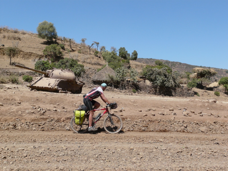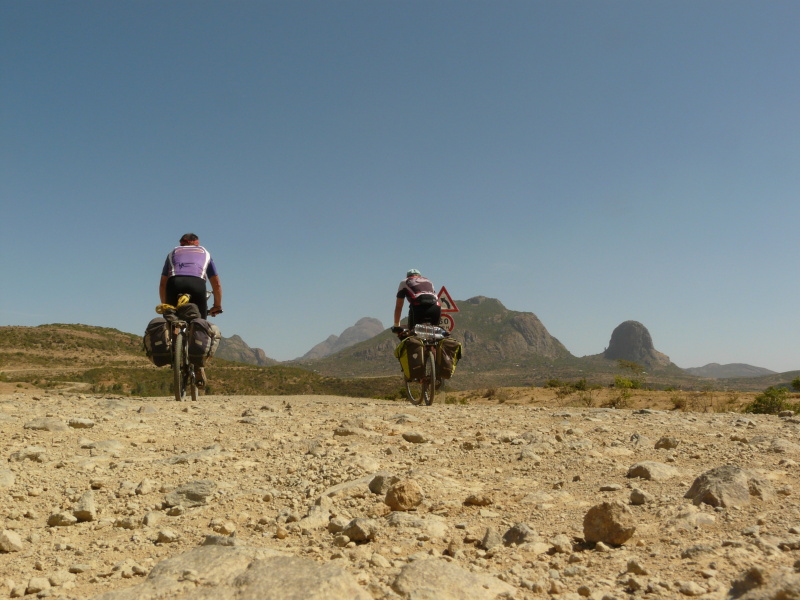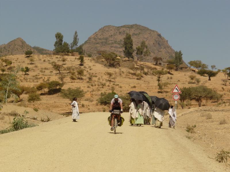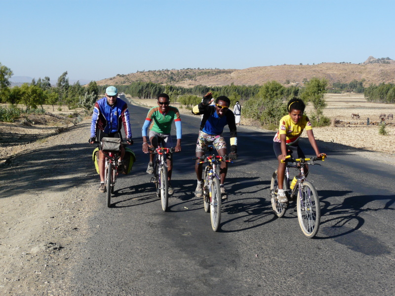 Hned jak jsme ráno vyjeli, Zdeněk přetrhl řetěz, ale v jeho podání to bylo jen 5 minut zdržení. Městem Axum vede nepříliš kvalitní asfaltka, která pokračuje po rovině ještě dalších 8 km za město. Na tomto úseku jsme potkali trojičku mladých cyklistů, kteří zde trénovali tak, že zmíněných 8 km jezdili neustále tam a zpátky. Dál to je podle nich příliš „nebezpečné“. Tak jsme si říkali, co tady asi tak natrénují.