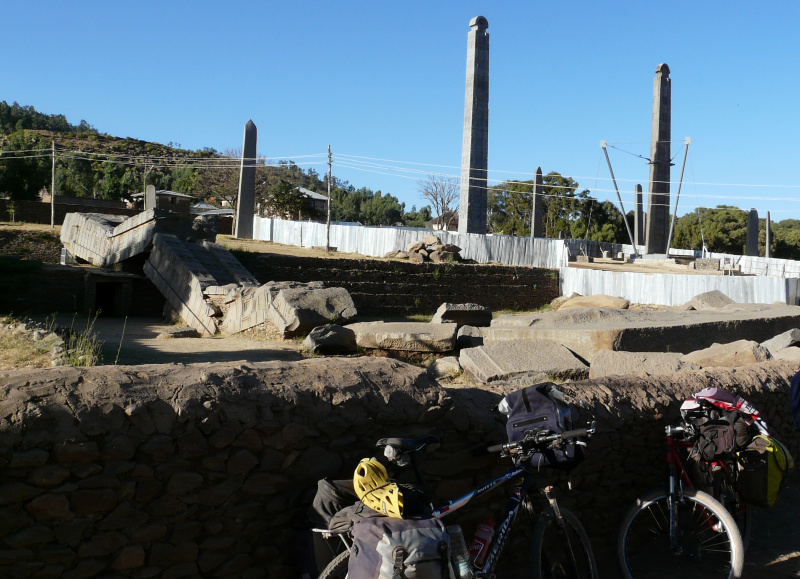 V cílovém městu Axum jsme se jeli podívat na největší turistickou atrakci – obelisky vytesané s jednoho kusu kamene, z nichž jeden kdysi ukradl Mussolini, a který Italové vrátili až v r. 2000. Já jsem osobně na nich neviděl nic moc zajímavého, ve skutečnosti jsou zahrnuty do kulturního dědictví Unesco. Největší z nich je 33 m vysoký a váží 520 tun. Byly postaveny ve 3. - 4. stol. n.l. Když si ale člověk uvědomí, s jakými pracovními prostředky a možnostmi v té době lidé disponovali, sloupy vyžadují přinejmenším obdiv nad zručností tehdejších řemeslníků. Jeden ze sloupů je spadený a rozlomený na několik kusů.
