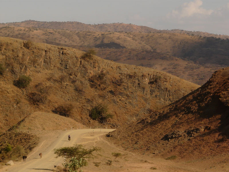 Když jsme asi v 15 hod. odpoledne vyjížděli z vesnice, kde jsme si dali své dnešní jediné jídlo (mimo snídaně) – výborné skopové s injarou a zalité jogurtem, uviděl jsem stejný obrázek jako už několikrát v předešlých dnech. Na všechny strany směrem před námi byla propast dolů a v dálce, na protějším hoře, malinká cestička vinoucí se nahoru. Na deseti km jízdy jsme spadli o 600 výškových metrů. Dole jsme potkali dvě karavany velbloudů jdoucí zřejmě pro sůl do Sudánu. Jeden z velbloudářů chtěl, abychom za to, že je fotíme, zaplatili nebo alespoň dali vodu. Ukázal jsem mu, že mám jen vodu v cyklistické láhvi. (Zásoby v taškách jsem přirozeně zatajil, protože nás teď čekalo mnoho km stoupání.) Ukázal jsem, že mu můžu alespoň z láhve nalít přímo do pusy. Kývl že ano, ale hned vodu vyprskl a křičel něco, co buď bylo v překladu „fuj“ nebo něco mnohem sprostšího. Nebylo se ani čemu divit – teplá voda z plastového bidonu, nevymývaného už několik dní, je opravdu pitelná jen ve velké nouzi.