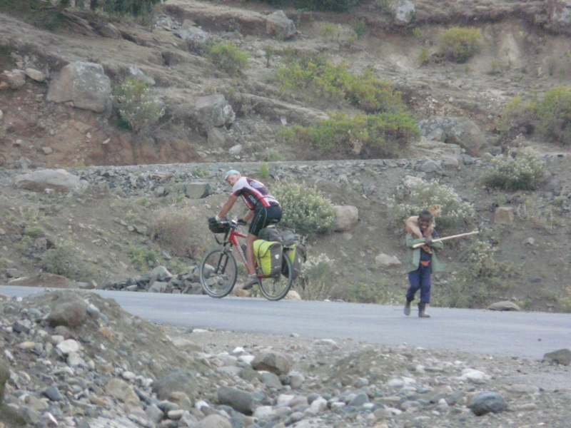 Odevšud tady vybíhala mimořádně otravná děcka, která chtěla peníze nebo tužku. Absolutně jim nebylo možné ujet. Jeli jsme zatáčkami hlemýždím tempem nahoru a děti buď běželi s námi nebo si zkrátily cestu a kolmo nám nadbíhaly v zatáčkách. Bylo obdivuhodné, jak rychle bosky šplhali po příkré kamenité stráni nahoru. Jeden, asi pětiletý kluk, takto za námi běžel neuvěřitelně dlouho s malým kůzletem na ramenou. V každé zatáčce jich čekalo dalších pět, takže po v polovině stoupání jich už bylo několik desítek.