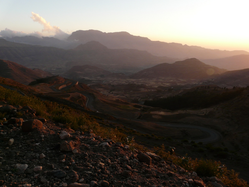 Z Abi Adi to bylo pak neustále z kopce, až jsme klesli do nadm. výšky 1650 m n.m. Pak se to po velmi nekvalitní kamenité cestě začalo zvedat a po chvíli jsem si s hrůzou uvědomil, že ta stěna daleko před námi je to, co musíme přejet. Ještě chvíli předtím jsme se se Zdeňkem ze srandy dobírali, že to zvrásnění vysoko nad námi je cesta. V tu chvíli jsme to považovali za naprosto nereálné, po pár hodinách stoupání jsme už věděli, že klikatá čárka vysoko nahoře a v dáli cestou opravdu je. Alespoň výhledy stály za to – dnes to byly červené kolmé skály, pak žluté kopce se zelenými stromy až po tmavohnědé hory. Moc pěkná podívaná.