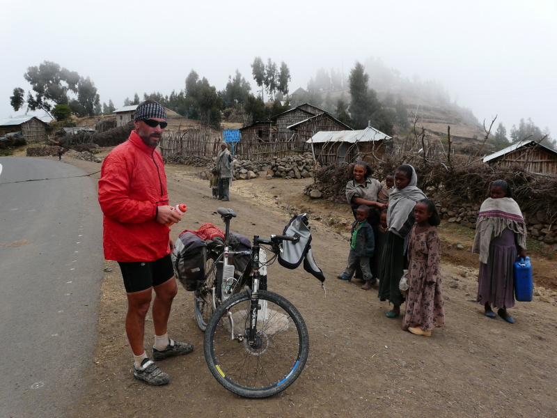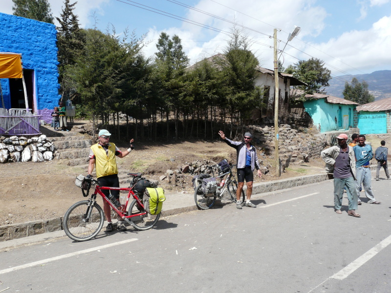 Nahoru – do výšky 3250 m n.m. jsme vyjeli přesně v 18 hod. To už teplota klesla na 13 °C a velmi rychle se stmívalo. Navíc začal foukat velmi chladný protivítr. Navlékli jsme na sebe co se dalo a rychle jeli dolů. Do první vesnice (v nadm výšce 2670 m n.m.) jsme přijeli už za úplné tmy. Rychle jsme našli ubytování za 15 birr (24 Kč), ale pak začal kluk smlouvat, že to myslel na osobu a ne za pokoj. Tak jsme mu řekli že ano, ale že každý bude mít svoji místnost. A najednou to bylo zase 15 birr, což vůbec nechápu, protože celá řada místností k pronájmu zela prázdnotou a hoch si mohl přijít zcela bezpracně na dvojnásobek.