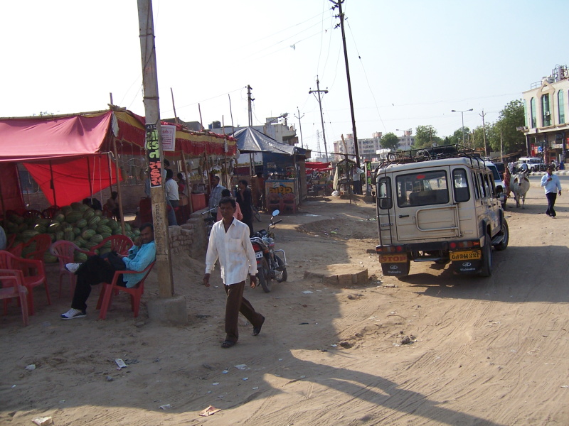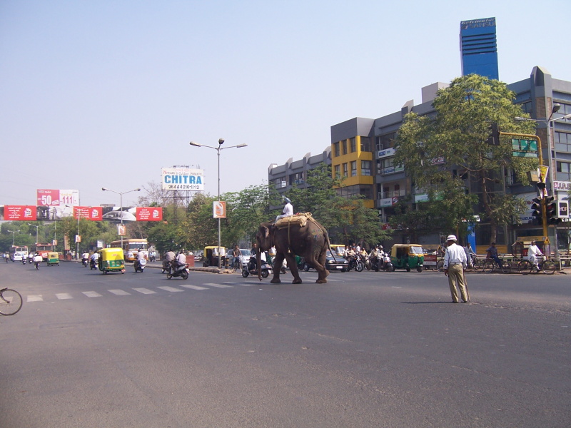 Kdybych byl v Indii poprvé, domky a život kolem by mi občas připadaly hodně exotické, takto jen upoutali mou pozornost dva sloni jako účastníci provozu a spousta povozů, tažených velbloudy. Naštěstí později vedla souběžně podél dálnice i úzká silnička, takže jsem byl ušetřen přímého kontaktu s náklaďáky a autobusy, na druhé straně mě zpomalovalo nesčetné množství retardérů, vedoucí vždy přes celou šíři silnice.