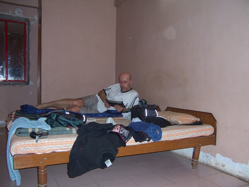Před spaním jsem se natřel proti komárům Repelentem, spolkl jsem tabletku B-komplexu (zápach vit. B, vylučovaný póry prý komáry také odpuzuje), pustil jsem větrák umístěný na stropě a pokoušel se usnout. Tento však neměl žádné mezipolohy – buď fučel tak, že vše nepřipevněné létalo po místnosti nebo vůbec. Ač nerad, spolkl jsem polovinu prášku na spaní, protože bych v tomto větru neusnul. Navíc jsem byl tak přetažený a ještě nezaklimatizovaný, že by mi i za dobrých podmínek dělalo potíže spát. Znám to, cítím se podobně vždy první dvě noci každé mé expedice.