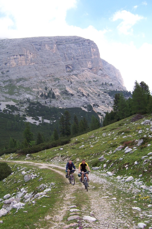 Brzy ráno jsme sjeli do Cortina d´Ampezzo (1200 m n.m.). Toto malebné město určitě stojí za samostatnou prohlídku, my zde byli však již vloni, takže jsme se nezdržovali a po krátké snídani před obchodem potravin jsme vyrazili směrem na horský průsmyk Limojoch (2159 m n.m.). Cesta je hned z města velmi dobře značena a nedá se zde zabloudit. Zprvu má charakter naučné stezky podél říčky Boite a vede souběžně se silnicí vedoucí severně na město Toblach. Stoupání není příliš příkré, je zde spousta mimořádných výhledů do okolní krajiny a člověk je tak uchvácen dílem Matky přírody, že se to ani nedá slovy popsat. Po pár kilometrech stoupání přitvrzuje a od určitého okamžiku se dá jet již jen na nejlehčí převod, kterým kolo disponuje. Stezku využívá hodně turistů s hůlkami (tzv. Nordic walking) a ani bajkeři zde nejsou výjimkou. My jsme však s objemnými taškami byli raritou. Několikrát se dokonce stalo, že jsme vyjeli některý úsek (i 23%), kde ostatní bajkeři tlačili a jejich udivené pohledy byly pro nás tím nejlepším dopingem.